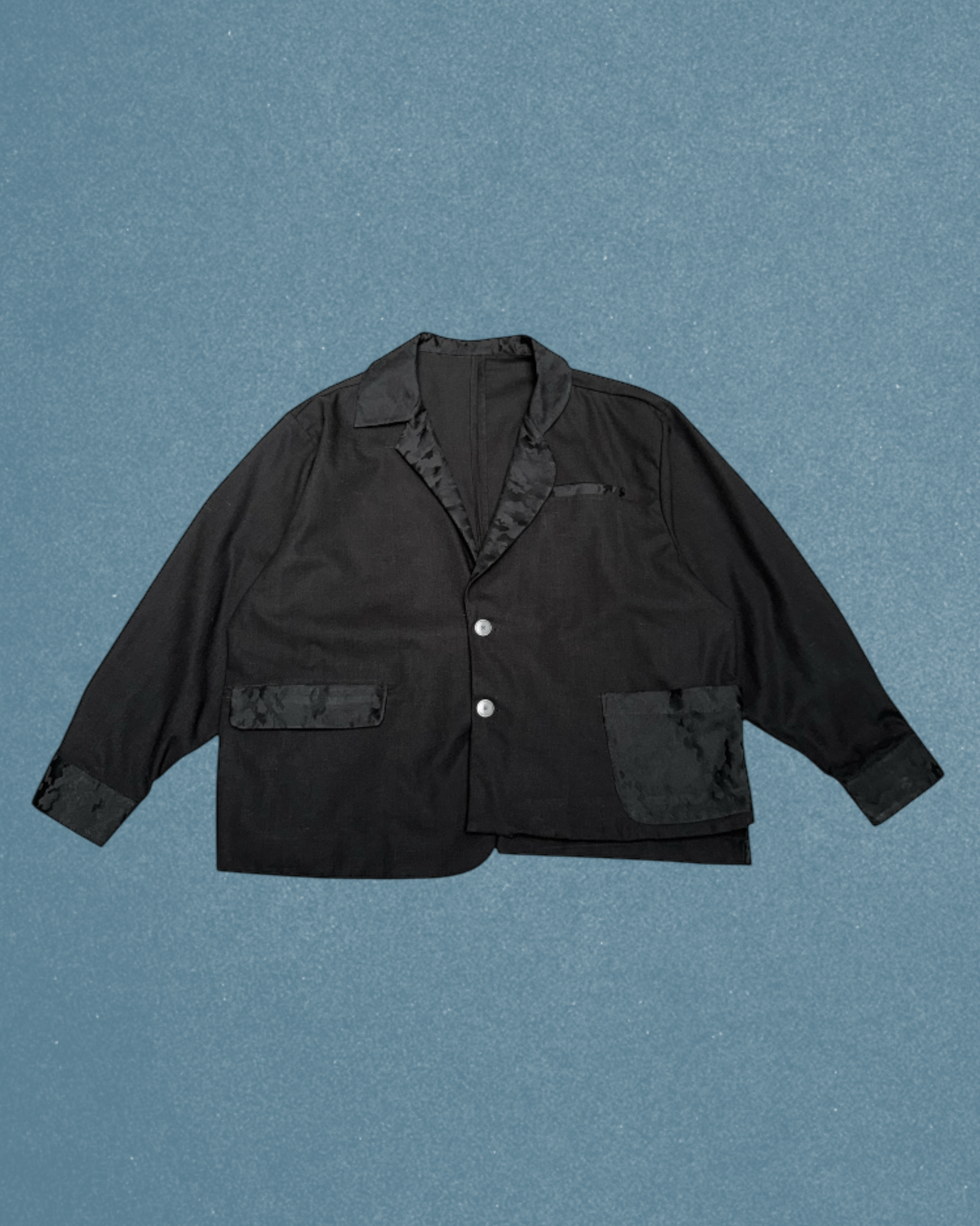 A fresh take on a classic suit jacket—this piece stands out with an asymmetrical lapel and hem, giving it a unique, modern edge. The camo-accented lapel adds just the right amount of contrast, while multiple pockets keep things practical.